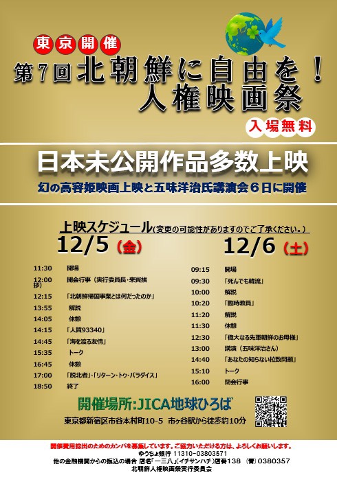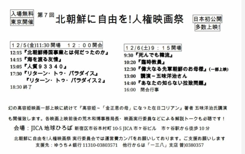 (お知らせ)「第7回 北朝鮮に自由を!人権映画祭」のご案内 東京開催 お知らせ Twitter Facebook LINE コピー 2025.11.27 目次 日 時場 所詳 細 日 時 1日目:2025年12月5日(金) 11:30開場2日目:2025年12月6日(土) 09:15開場 場 所 〒162-8433東京都新宿区市谷本村町10-5(JICA市ヶ谷ビル内)(注)JICA本部(千代田区二番町/最寄駅「麹町」)ではありません。 JR中央線・総武線 「市ケ谷」 徒歩10分都営地下鉄新宿線 「市ヶ谷」A1番出口 徒歩10分東京メトロ有楽町線・南北線 「市ケ谷」6番出口 徒歩8分 詳 細