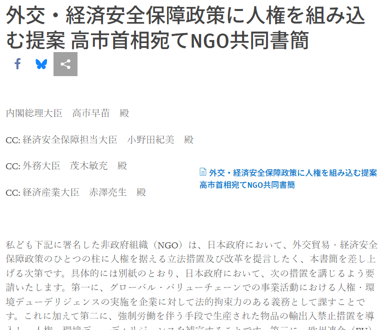 外交・経済安全保障政策に人権を組み込む提案 高市首相宛てNGO共同書簡